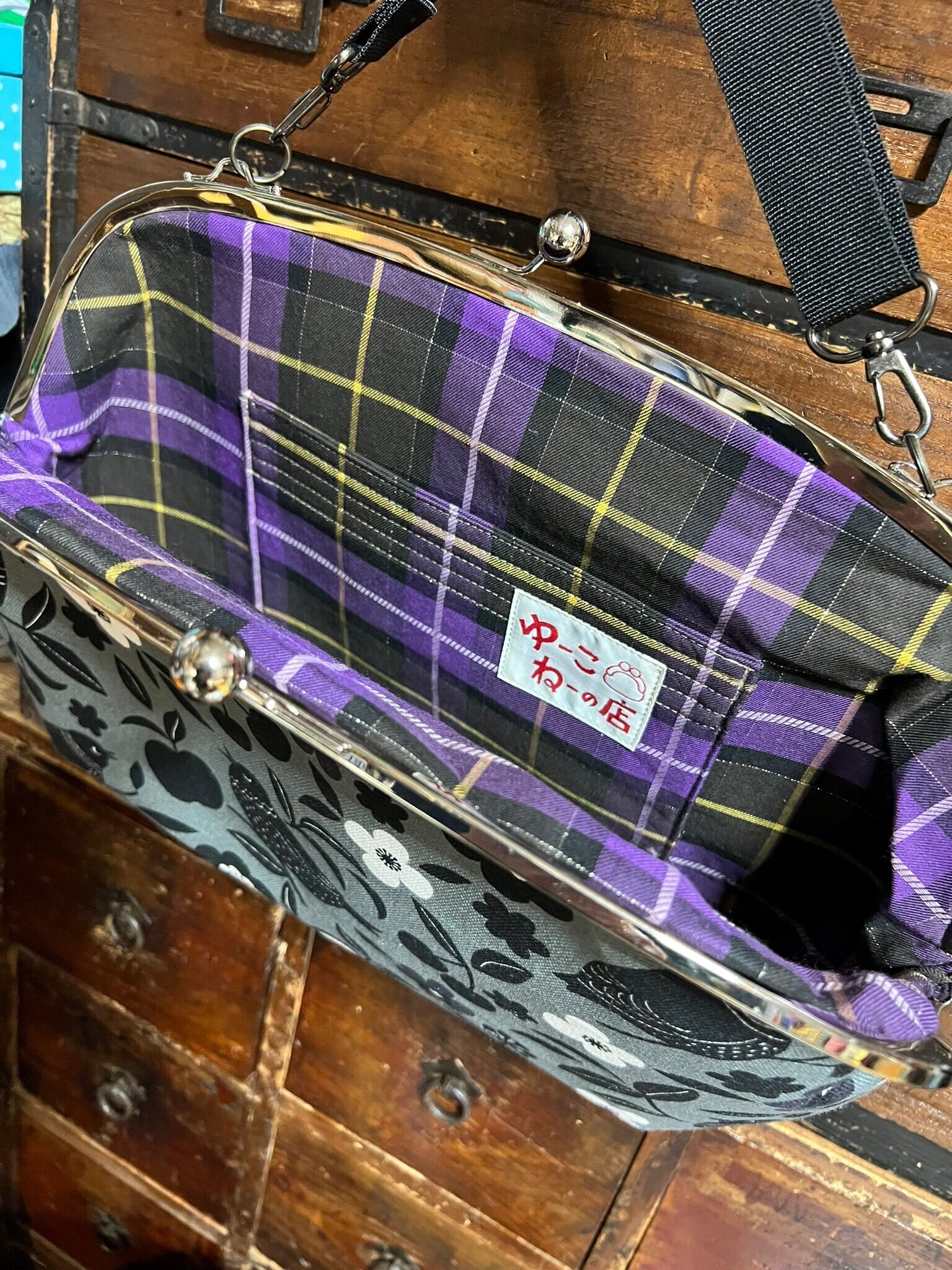 大型のがま口バッグです。表布は帆布を使用しているので、とてもしっかりとした風合いとなっています。日本最大の大きな金属の口金を使用しています。ふっくらとしたデザインですが、厚みが10センチ程に抑えてあるので持ちやすいです。内側のポケットも両側に付いています。片側は大きめのポケット、もう片側は仕切りが有るので2箇所に分けて入れられる様になっています。その片方のポケットにはマチがあるので、かさばる物を入れても外見が変わりません。また、ポケットの口はミシンで縫込み、強度を上げていますので、長い間お使いになっても張りが有り、物の出し入れがスムーズです。ショルダー紐はアクリル製の紐で太目の物なので、肩に掛けても楽に使用できます。